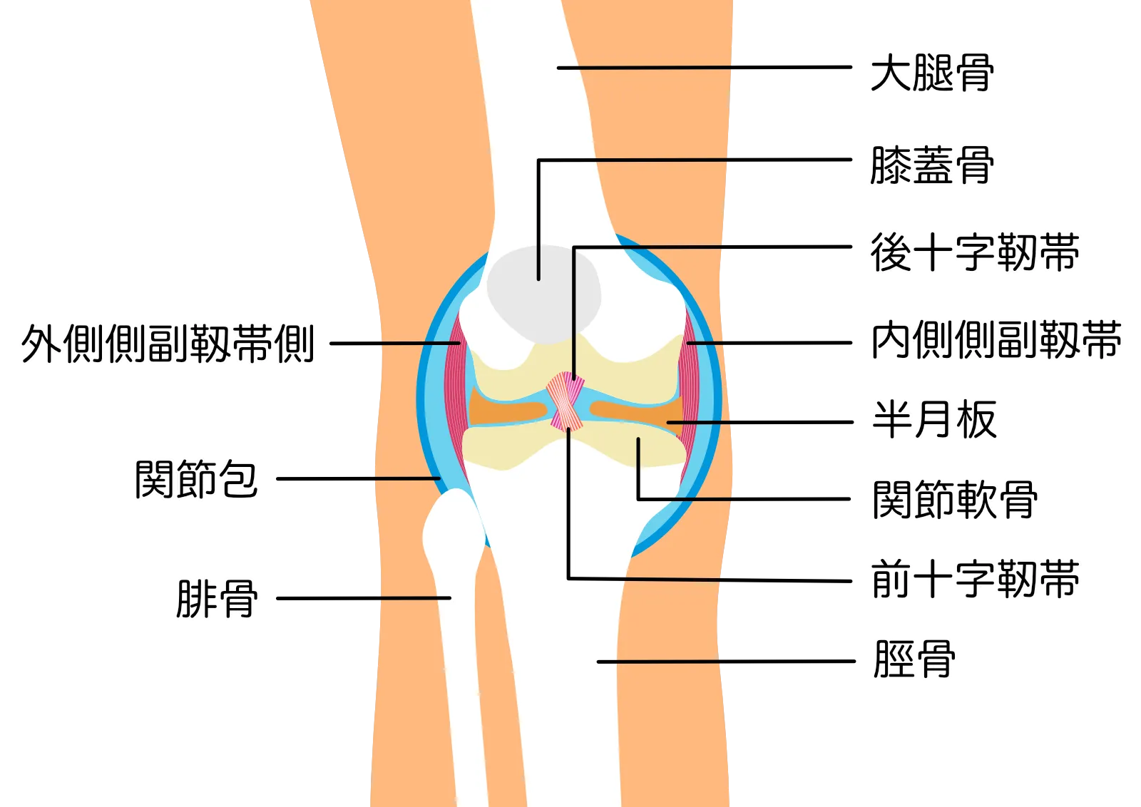 「膝の捻挫」と言われるほど発生頻度の高い疾患です。大腿骨と脛骨をつなぎ、膝が内側に動き過ぎないよう支える組織が損傷します。サッカーやアメフト、ラグビーなど急な方向転換の多いスポーツで起こりやすいです。この靭帯を損傷すると、膝の内側を押すと痛み、腫れや熱感、不安定感が生じます。