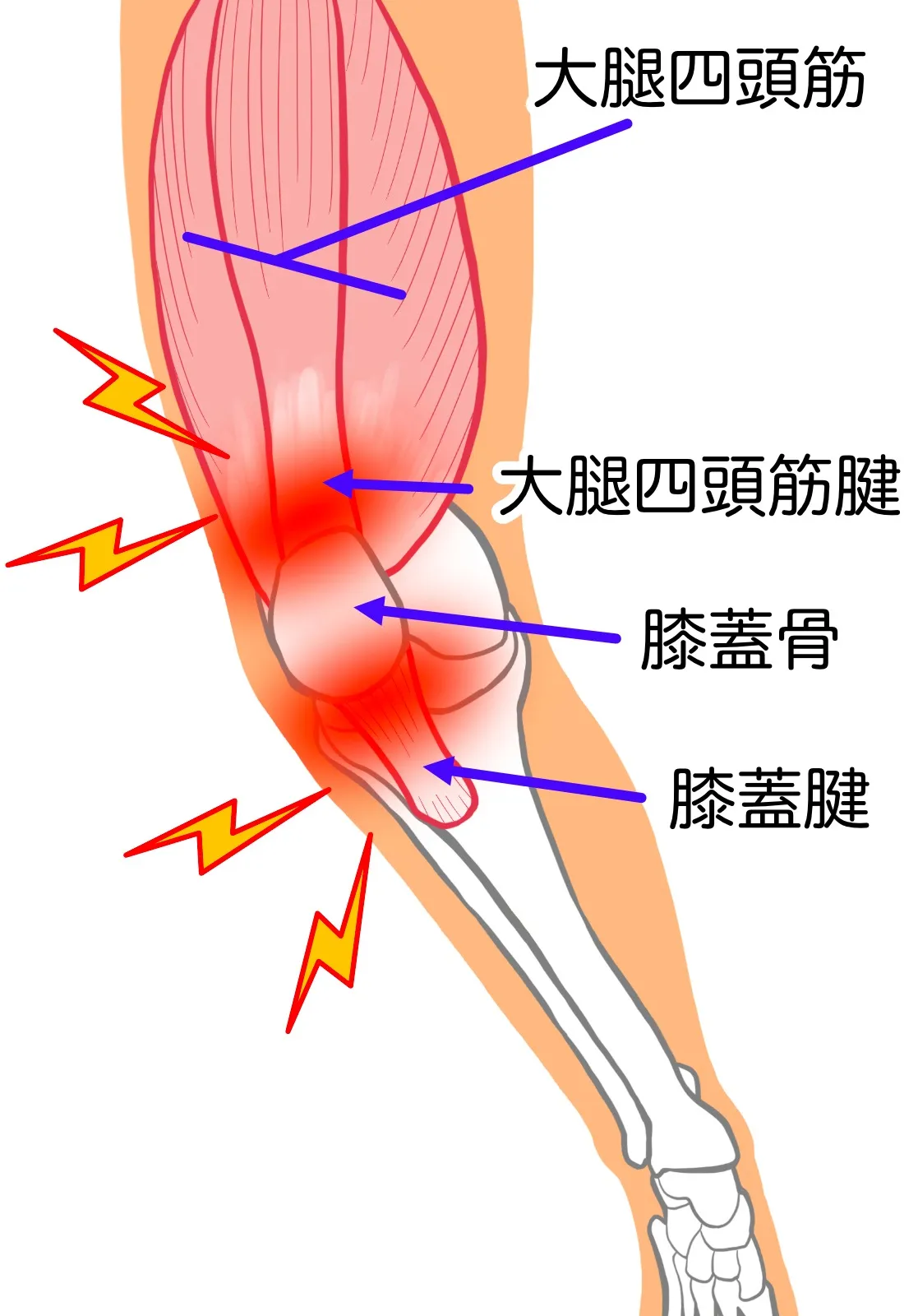 膝蓋骨の上部にある大腿四頭筋の腱が炎症を起こす症状です。主な原因はオーバーユース(使いすぎ)や柔軟性の低下、筋力バランスの乱れにより、運動時の痛みが生じます。特に、階段の上り下りやスポーツ中に痛みが強まることがあります。さらに、初期には局所的な痛みですが、炎症が進行すると痛みの範囲が広がることもあります。